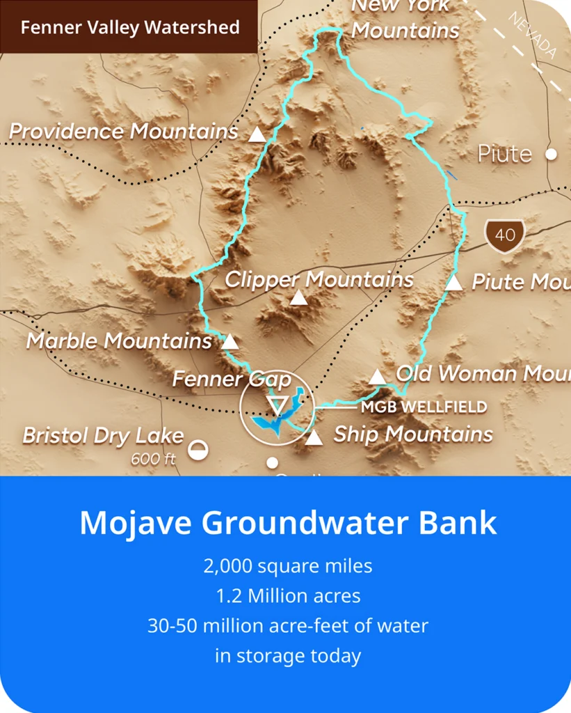 Every minute, water that could sustain families, farms, and ecosystems is lost to evaporation at the dry lakes of Fenner Gap. The Mojave Groundwater Bank transforms this loss into opportunity by capturing and preserving that water for communities that too often go without. Fed by natural recharge of up to 50,000 acre-feet annually from mountain runoff, the system combines modern water banking with ongoing monitoring and active recharge efforts to protect both people and the desert environment for generations to come.
